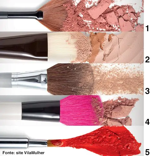 4. Para blush: Existem dois tipos: com cerdas arredondadas, como o da foto, e com cerdas chanfradas. Para colocar o produto em excesso, dê uma assopradinha no pincel antes de encostá-lo nas maçãs do rosto. Com o resto que sobra no pincel, realce testa, nariz e a linha da mandíbula.